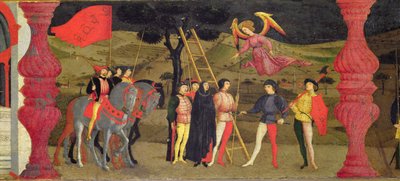 Predella van de ontheiliging van de hostie: De berouwvolle christelijke vrouw wordt opgehangen voor het verpanden van de geconsacreerde hostie, ca.1468 (tempera op paneel) (detail)(Predella of the Profanation of the Host: The Repentant Christian Woman is Hanged for Pawning the Consecrated Host, c.1468 (tempera on panel) (detail))Paolo Uccello |