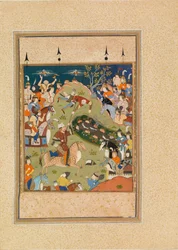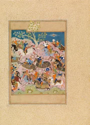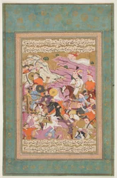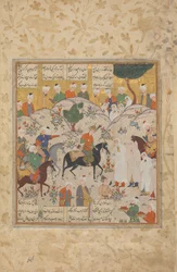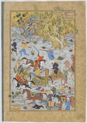 Rustam vecht tegen Puladvand Div, folio uit een Shanameh(Rustam Fighting Puladvand Div, folio from a Shanameh (ink & opaque wc on paper))Persian School |