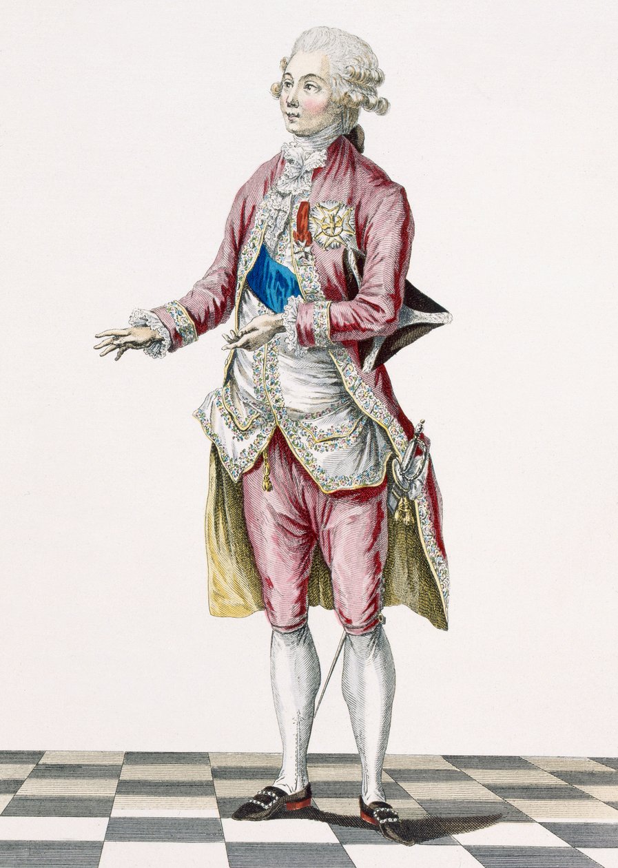 Hertog in landelijke kleding versierd met de Koninklijke Ordes, gegraveerd door Dupin, plaat uit 'Galeries des Modes et Costumes Francais'(Duke in country attire decorated with the King's Orders, engraved by Dupin, plate from 'Galeries des Modes et Costumes Francais', c.1778-87, 1760 )Pierre Thomas Le Clerc |