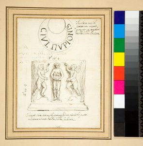 Man en vrouw (bustes) in centrale cirkel(Husband and wife (busts) in central circle (black chalk, some with pen and brown ink. coloured with watercolor))Pietro Santi Bartoli |