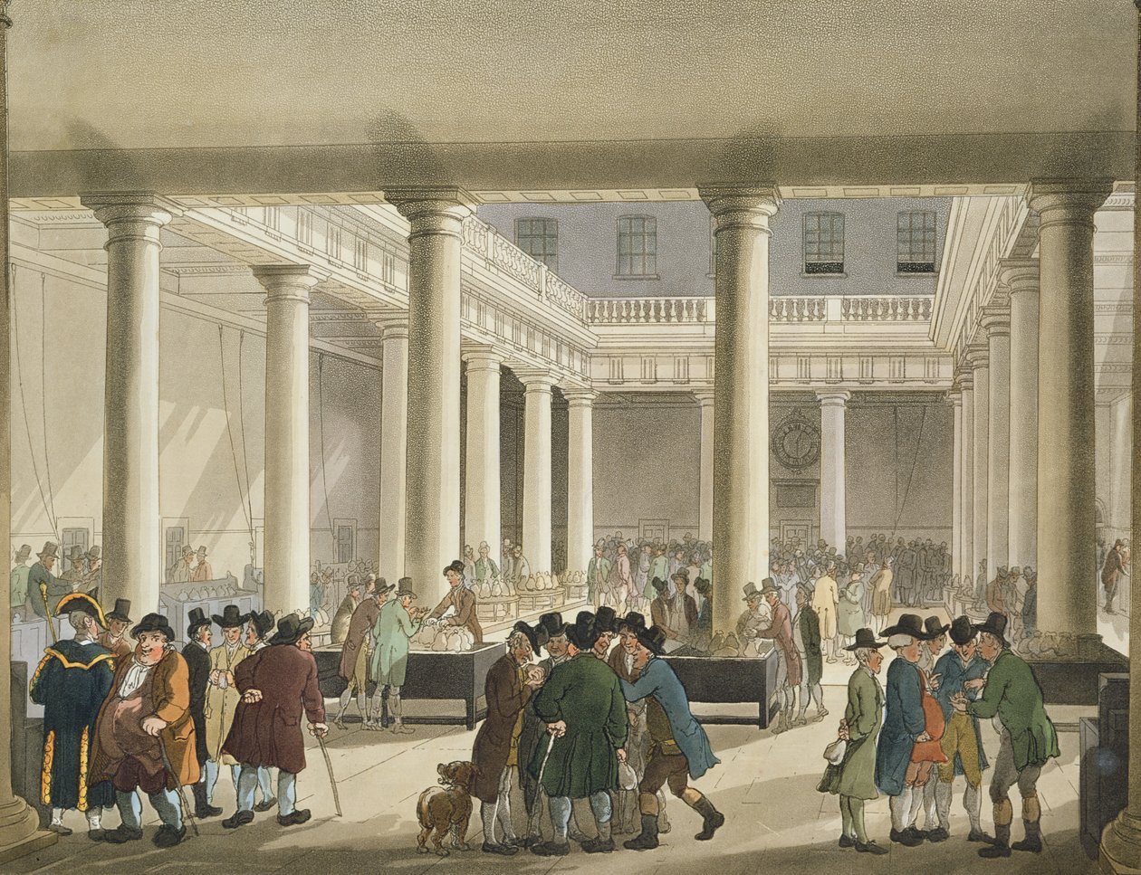De Graanbeurs uit Ackermann's 'Microcosm of London', 1808(The Corn Exchange from Ackermann's 'Microcosm of London', 1808 (aquatint))Pugin and Rowlandson |