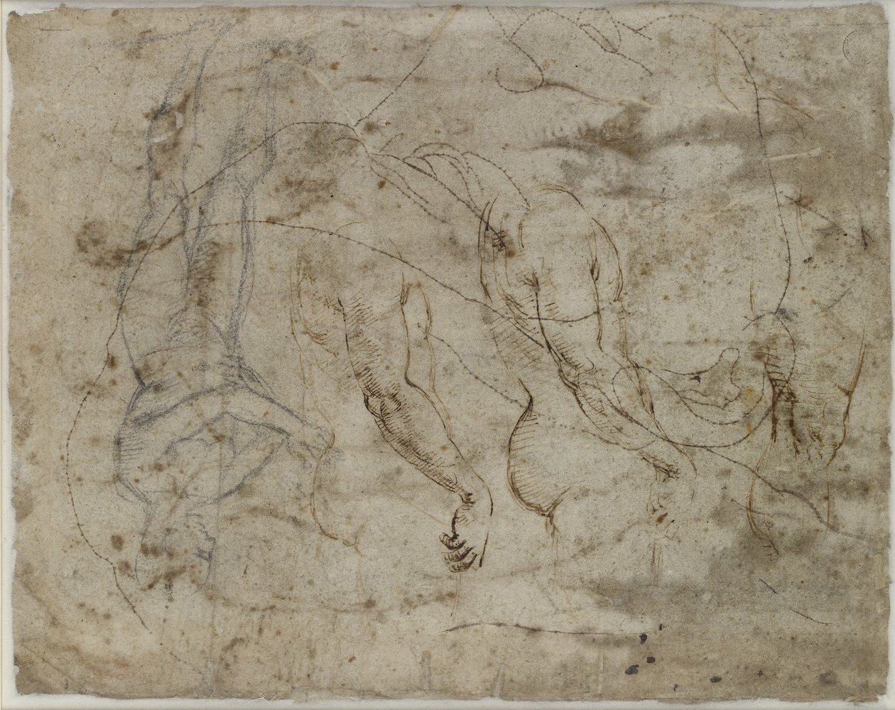 Verso: twee studies van armen, een profiel omhoog kijkend en een staand figuur, WA1846.164(Verso: two studies of arms, a profile looking upwards and a standing figure, WA1846.164 (pen & ink, black chalk, the profile pricked for transfer))Raffaello Sanzio Raphael |