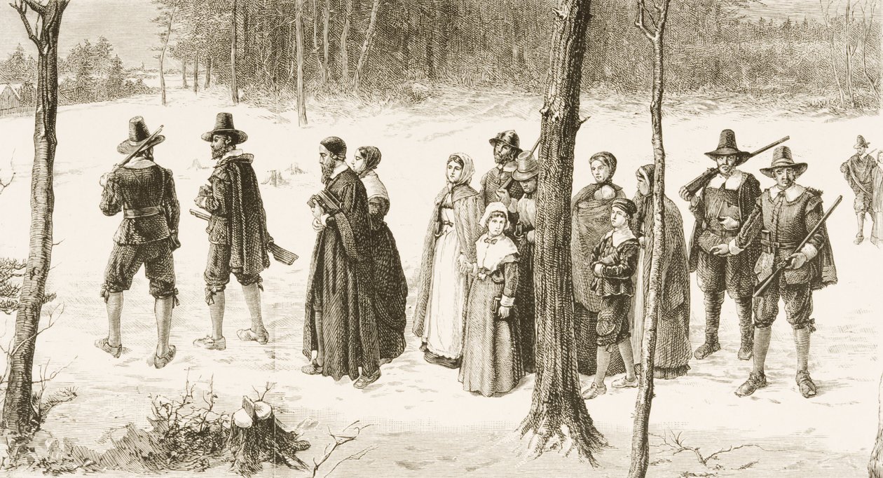 Pelgrimsvaders gaan naar de kerk, ca. 1880(Pilgrim fathers going to church, c.1880 )Reverend Samuel Manning |