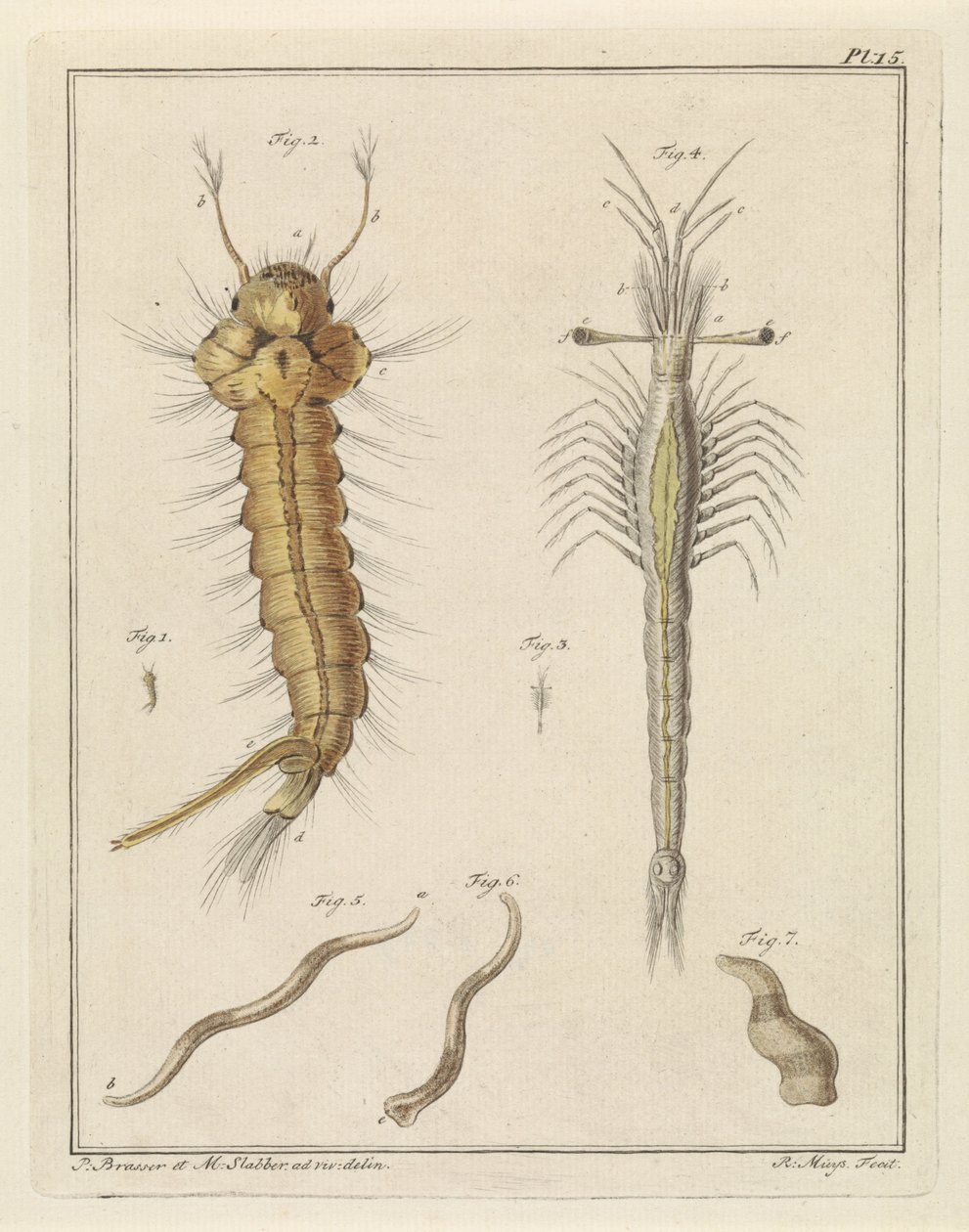 Steekmug, Slabbers trompetoog en een worm(Mosquito, Slabber's Trumpet Eye and a Worm)Robbert Muys(print maker),P.M. Brasser(after drawing by),Martinus Slabber(after drawing by) |