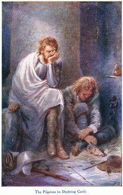 De pelgrims in het kasteel van Doubting (kleurenlitho)(The Pilgrims in Doubting Castle (colour litho))Robert Ambrose (after) Dudley |