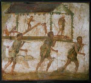 Zuilfresco dat wolproductie afbeeldt, uit Pompeii, Fullonica van Veranio Ipseo(Pillar fresco depicting wool manufacturing, from Pompeii, Fullonica of Veranio Ipseo)Roman |
