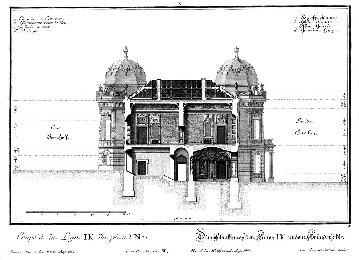 Doorsnede van de westelijke tweelaagse zijvleugel(Schnitt durch den westlichen zweigeschossigen Seitentrakt)Salomon Kleiner |