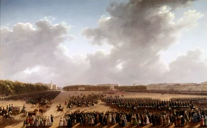 Parade op het Champ de Mars, op de voorgrond Alexander Poesjkin en Nicolaas I te paard