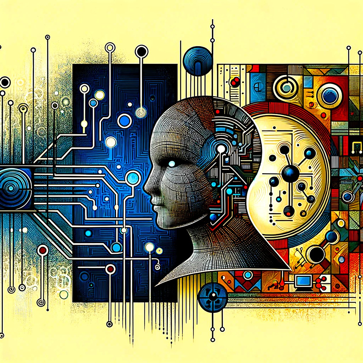 Deze afbeelding is gemaakt met behulp van generatieve AI. 2023 · digitale Kunst, KI generiert · Afbeelding ID: 1480097 Dit structureel eenvoudige kunstwerk gaat over de vraag hoe een AI zichzelf zou verklaren en over de interactie tussen mens en AI. Het doet denken aan het begin van digitale werken, net zoals het een puur door mensen gemaakte afbeelding zou kunnen zijn. De circuits links in beeld, het menselijke hoofd in het midden en het kleurrijke resultaat rechts geven de symbiose tussen mens en machine op indrukwekkende wijze weer.