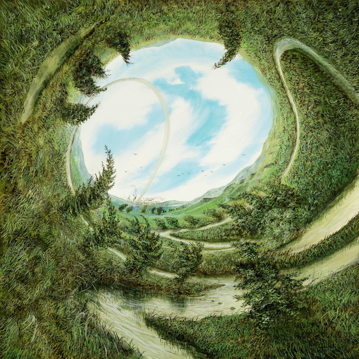 Het lijkt er zelfs op dat de geschilderde waterwegen op ongewone plaatsen stromen door een verandering in het effect van de zwaartekracht. Blijkbaar komt de zwaartekracht uit verschillende richtingen, wat in werkelijkheid niet mogelijk is. De constante zwaartekracht vanuit het middelpunt van de aarde kan alleen verticaal werken, niet horizontaal.