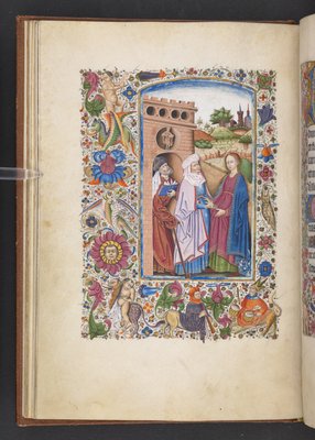 De Visitatie, uit een 'Getijdenboek'(Add MS 50004 f.16v The Visitation, from a 'Book of Hours' (ink, colour & gold on vellum))Spanish School |