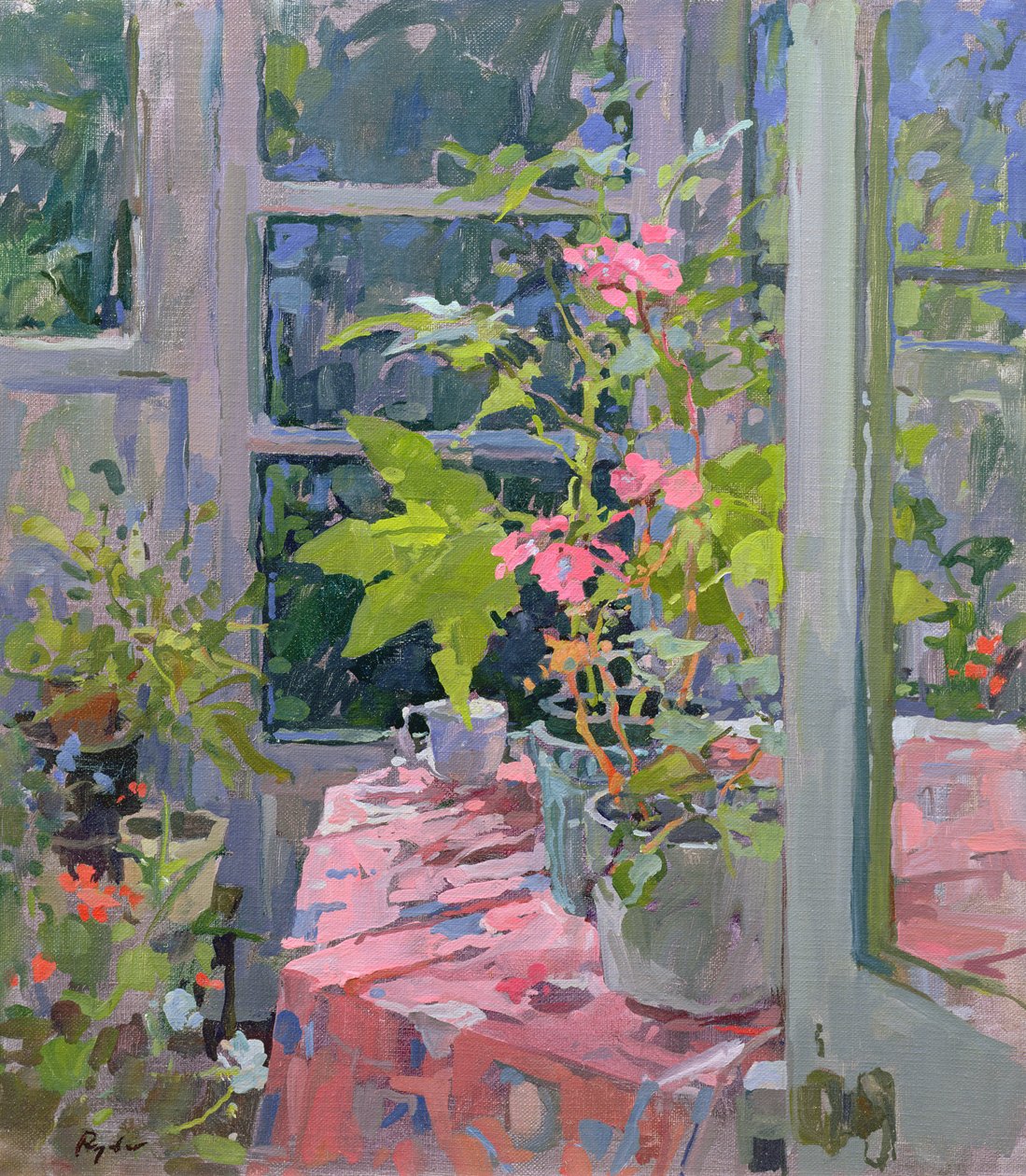 Geraniums en Roze Doek(Geraniums and Pink Cloth )Susan Ryder |