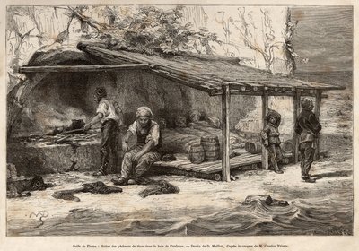 Een tonijnvisserij in de baai van Proelucca, Golf van Fiume (of Rijeka, Istrië), drie vissers slapen nog, gewikkeld in dekens, een ander zal de uitkijk vervangen, een ander zal de keuken voorbereiden en de mos dwaalt aan de voet.(A tuna fishing lodge in the bay of Proelucca, Gulf of Fiume (or Rijeka, Istria), three of the fishermen are still sleeping, wrapped in blankets, another will equip and replace the lookout, another will prepare the kitchen and the moss wanders at the foot o)Theodore Weber |