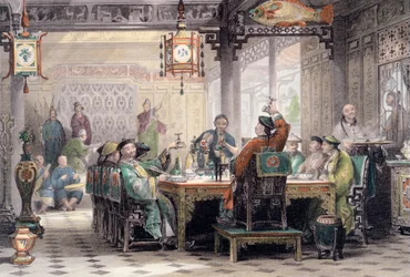 Dinerfeest in het huis van een mandarijn, uit 'China in a Series of Views' door George Newenham Wright, gegraveerd door G. Paterson, 1843(Dinner Party at a Mandarin's House, from 'China in a Series of Views' by George Newenham Wright (c.1790-1877) engraved by G. Paterson, 1843 )Thomas Allom |