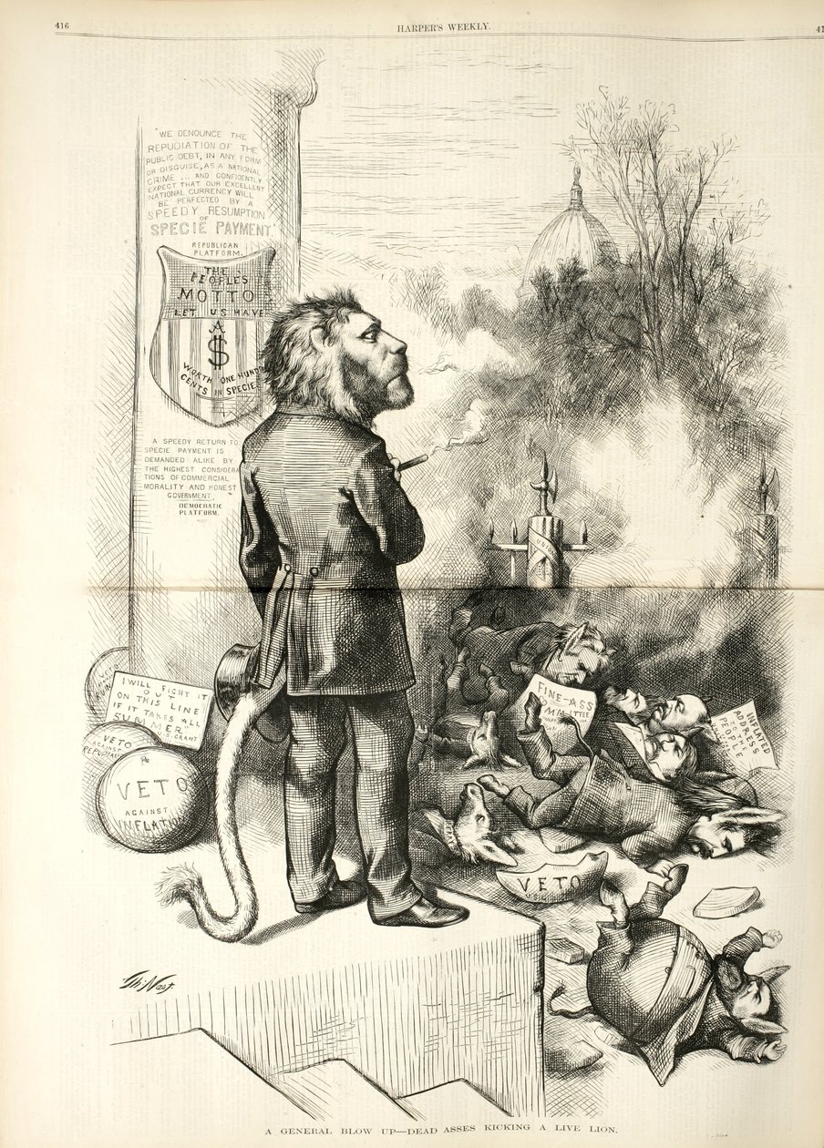 Een Algemene Ontploffing - Dode Ezel Schopt een Levend Leeuw, 1874 (houtsnede)(A General Blow Up - Dead Asses Kicking a Live Lion, 1874 (wood engraving))Thomas Nast |