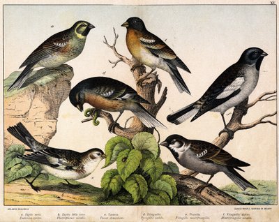 Passeres, Vinken Diverse lijster soorten (Turdus) Vogels, c.1860 a: Nachtegaal (Luscinia vera), b: Pettazzuro (Cyanecula suecica), c: Zwartkop (Sylvia atricapilla), d: Braamsluiper (Sylvia ciciera), e: Tuinfluiter (Sylvia salicaria), f: Grasmus (Sylvia curruca), g: Spotvogel (Hypolais icterina) - in Diverse soorten vinken (Fringilla) De 5 vogels links- a: Zwaluw (Parus major), b: Blauwoog (Parus coreulus), c: Zwartkop (Parus ater), d: Zwartoog (Lopophanes cristatus), e: Zwartoog (Parus palustris) De 4 vogels rechts- a: boerenzwaluw (Hirondo rustica), b: Zwaluw Vogels, ca. 1860 Diverses illustratie van vogels "Geschiedenis" natuurlijke vogels". ed. Hoepli, Milaan Gorzen (Emberiza) Illustratie voor "Natuurlijke geschiedenis van vogels", ed. Hoepli, Milaan Verschillende vogels, ca. 1900 (gravure) Vogels a: Lijster (Turdus viscivorus), b: Lijster (Turdus pilaris), c: Merel (Merula torquata), d: Blauwe Merel (Monticola cyanus), e: Merel (Merula nigra), f: Boheemse pestvogel (Ampelis garulus) - in a: Grijze klauwier (Lanius excubitor), b: Noordelijke klauwier (Lanius collurio), c: Roze-borstige klauwier (Lanius linor), d: Rode ara (Ara macao), e: Alexandrijnse papegaai (Palaeornis Alexandria), f: Banksian Cacatoes (Calyptorynchus banksii) - in Passeres, vinken a: Grijze papegaai (Psittacus erithacus), b: Kaketoe (Cacatua galerita), c: Toekan (Ramphastos temminckii), d: Zwarte specht (Picus Martius), e: Groene specht (Gecinus veridis), f: Grote bonte specht (Dendrocopus minor) - a: Bonte kraai (Corvus cornix), b: Kauw (Corvus monedula), c: Gaai (Garrulus glandarius), d: Notenkraker (Nucifraga caryocatactes), e: Geelsnavelchocad (Pyrrohocorax alpinus), f: Roodsnavelchocad (Pyrrhocorax pyrrhocorax) - in Parus: Meesjes en Parids Vogels, ca. 1860 Passeres, Vinken Huismus, 1864 Sturnus en Tanagra (Spreeuwen en Tanagers) a: Noordelijke leeuwerik (Alauda arvensis), b: Boomleeuwerik (Lullula arborea), c: Kuifleeuwerik (Galerita cristata), d: Spreeuw (Sturnus vulgaris), e: Waterspreeuw (Cinclus aquaticus), f: Lijster (Turdus musicus) - in Vogels Zangvogels: nachtegaal, rode vogel, zwarte vogel en lijster. 1792 (gravure) Vogels Eksters en gaaien