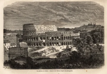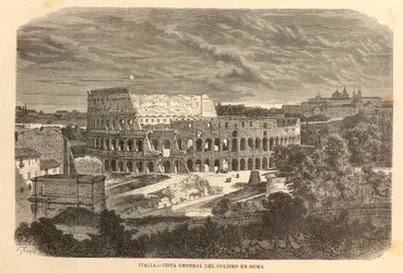 Algemeen zicht op het Colosseum, in Rome, Flavisch amfitheater voltooid in 80, onder het bewind van keizer Titus, met plaats voor maximaal 75.000 mensen, het bleef in gebruik tot de 6e eeuw, symbool van het keizerlijke Rome, gelegen ten oosten van het Rome(General view of the Colisee, in Rome, Flavian amphitheatre completed in 80, under the reign of Emperor Titus, accommodating up to 75,000 people, it remained in service until the 6th century, symbol of imperiale Rome, located east of the Roman Forum, it is )Unknown artist |