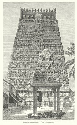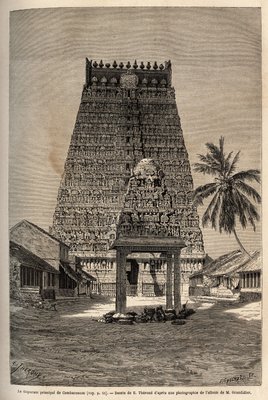 De hoofdgopuram van de tempel van Rama in Combaronum, bestaande uit 11 verdiepingen en bekroond door 11 ballen, de verschillende zijden van deze piramidale toren zijn volledig bedekt met beelden. Gravure ter illustratie van de reis naar de zuidelijke provi(The main gopuram of the temple of Rama a Combaronum, composed of 11 floors, and topped by 11 balls, the various faces of this pyramidal tower are completely covered with statues.Engraving to illustrate the journey to the meridional provinces of India, by A)Unknown artist |