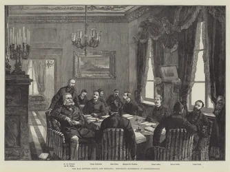 Een bijeenkomst van de Europese Conferentie van Constantinopel Servisch-Bulgaarse Oorlog, Turkije - Servisch-Bulgaarse Oorlog - Een bijeenkomst van de diplomatieke conferentie in Constantinopel - 1885 - in het illustere universum van 1886 (Alexander van Na(A meeting of the European Conference of Constantinople Serbia-Bulgarian War, Turkey - Serbo-Bulgarian War - A meeting of the diplomatic conference in Constantinople - 1885 - in the illustrious universe of 1886 (Alexander of Nalidov (Nelidoff) (1835-1910) -)Unknown artist |