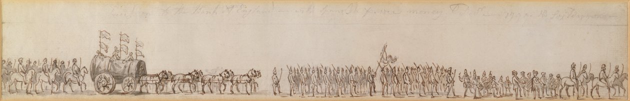 Processie die Spaans geld, veroverd door de Koninklijke Marine, naar de Bank of England brengt, 1799(Procession taking Spanish money captured by the Royal Navy to the Bank of England, 1799 (pen and ink drawing))Unknown |