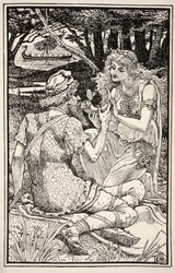 Toen de avond viel stapten ze weer in hun boot, versierden deze van boeg tot achtersteven met bloemen, illustratie uit 'Mrs Burton Harrison's Volk en Sprookjes'(When evening came they got into their boat again, wreathing it with flowers from prow to stern, illustration from 'Mrs Burton Harrison's Folk and Fairy Tales', 1885 )Walter Crane |