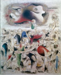 Atlantis Reliefafbeelding in kleur De waaier op blauw Zonder titel Poëzie met kleine fantoomvormen Eidos Drijvend Zwart spook Eidos met reeks IV Twee wereldtijden (variant op blauw) 1954, II. Kassel-documenten