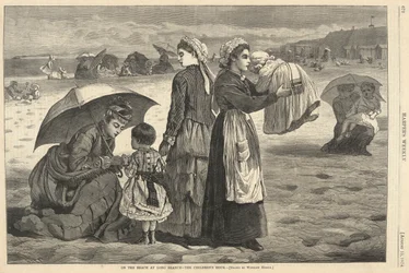 Op het strand van Long Branch - Het kinderuurtje, uit Harper's Weekly, 15 augustus 1874(On the Beach at Long Branch--The Children's Hour, from Harper's Weekly, August 15, 1874)Winslow Homer |