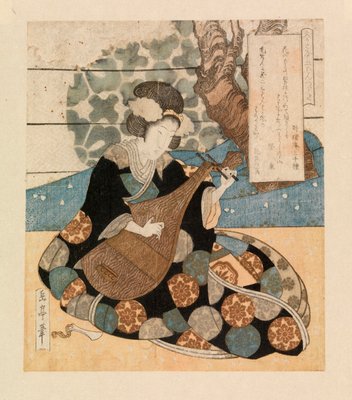 Dame die een instrument bespeelt, c.1804-40(Lady playing an instrument, c.1804-40 (colour woodcut))Yashima Gakutei |