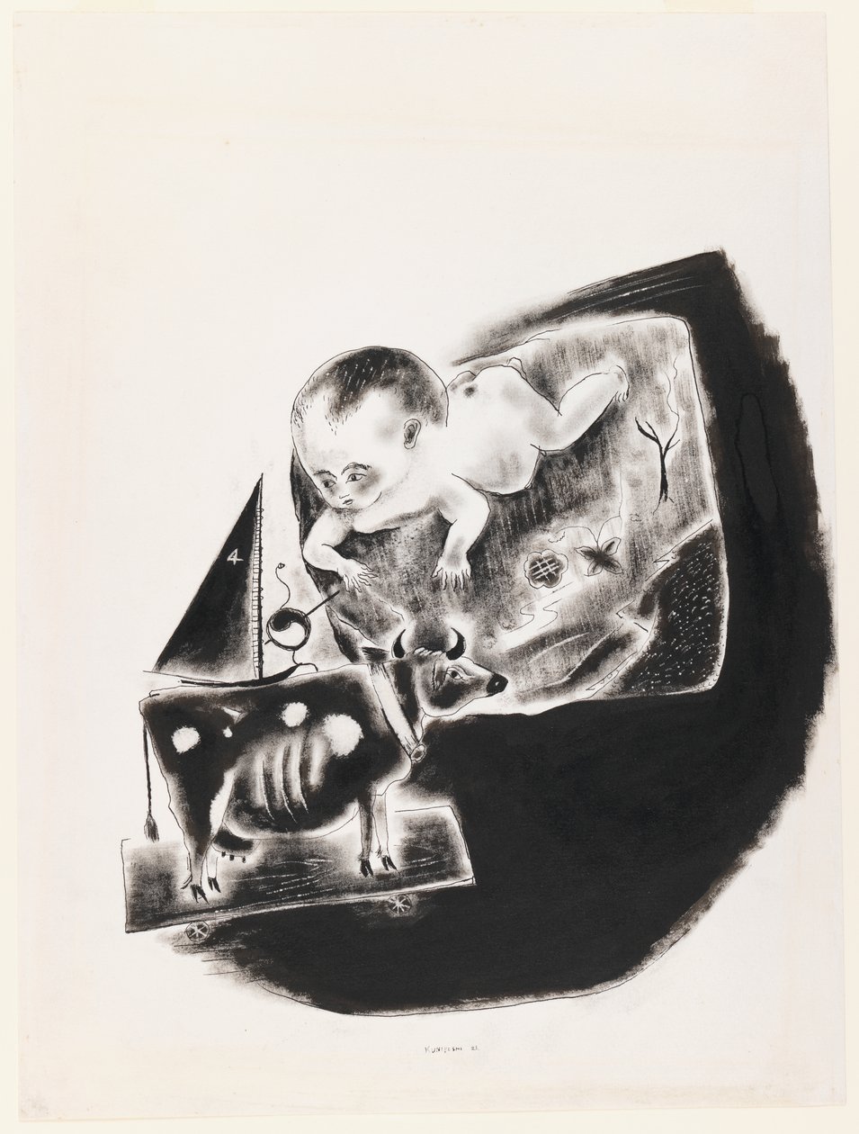 Baby en speelgoedkoe(Baby and toy cow)Yasuo Kuniyoshi |